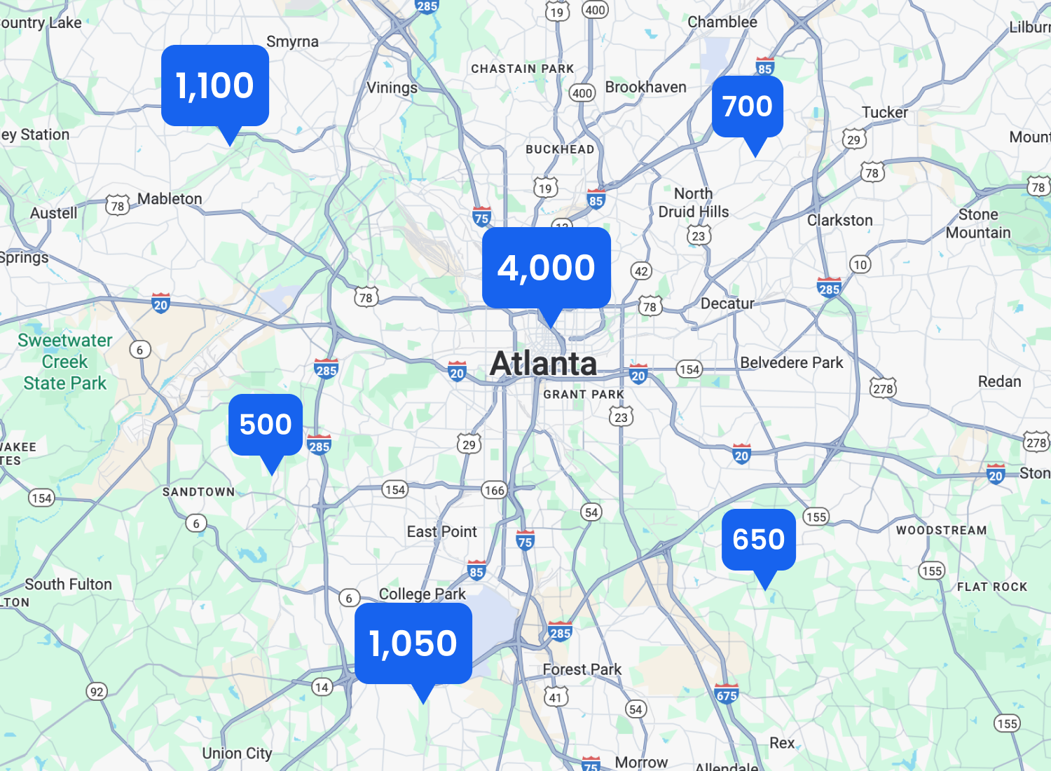 Map of approximate Spotters in the Atlanta area. Based on platform data.
