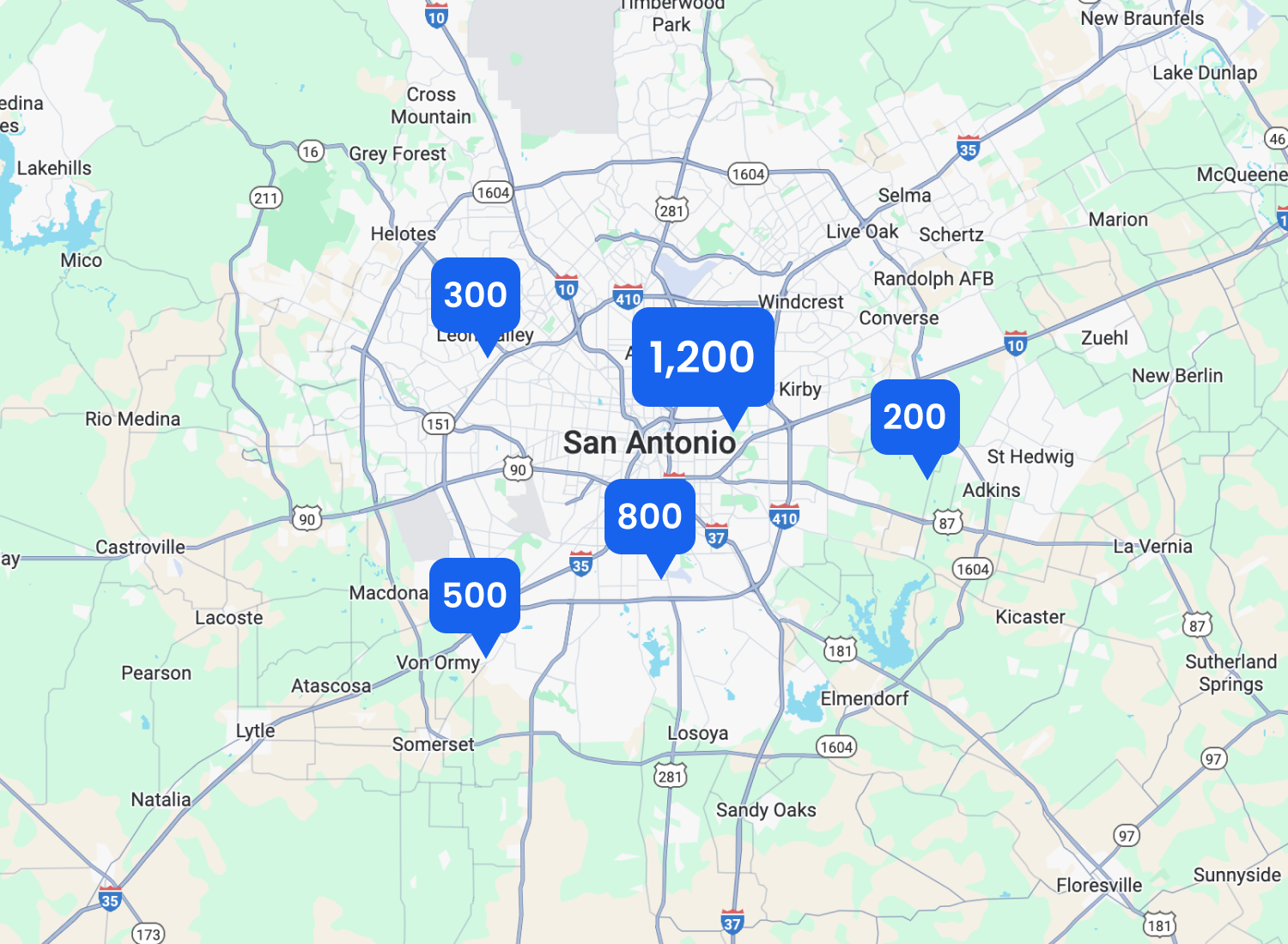 Map of approximate Spotters in the San Antonio area. Based on platform data.